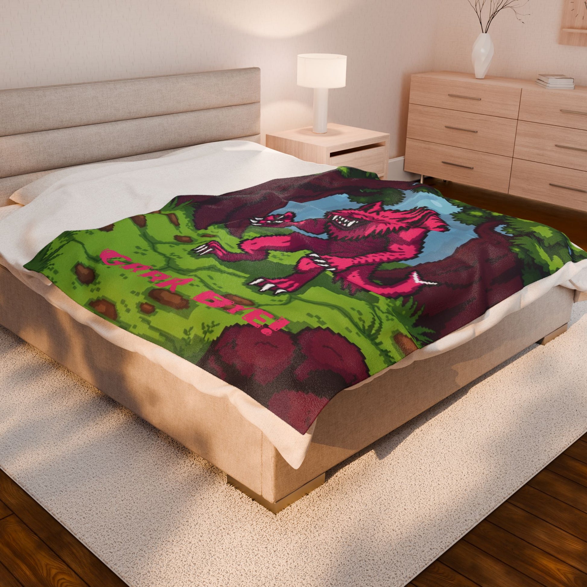“Grrr-Bye!” Pink Werewolf Velveteen Plush Blanket – Cute Horror Cozy Throw for Spooky Season, Self-Care & Fun Home Décor