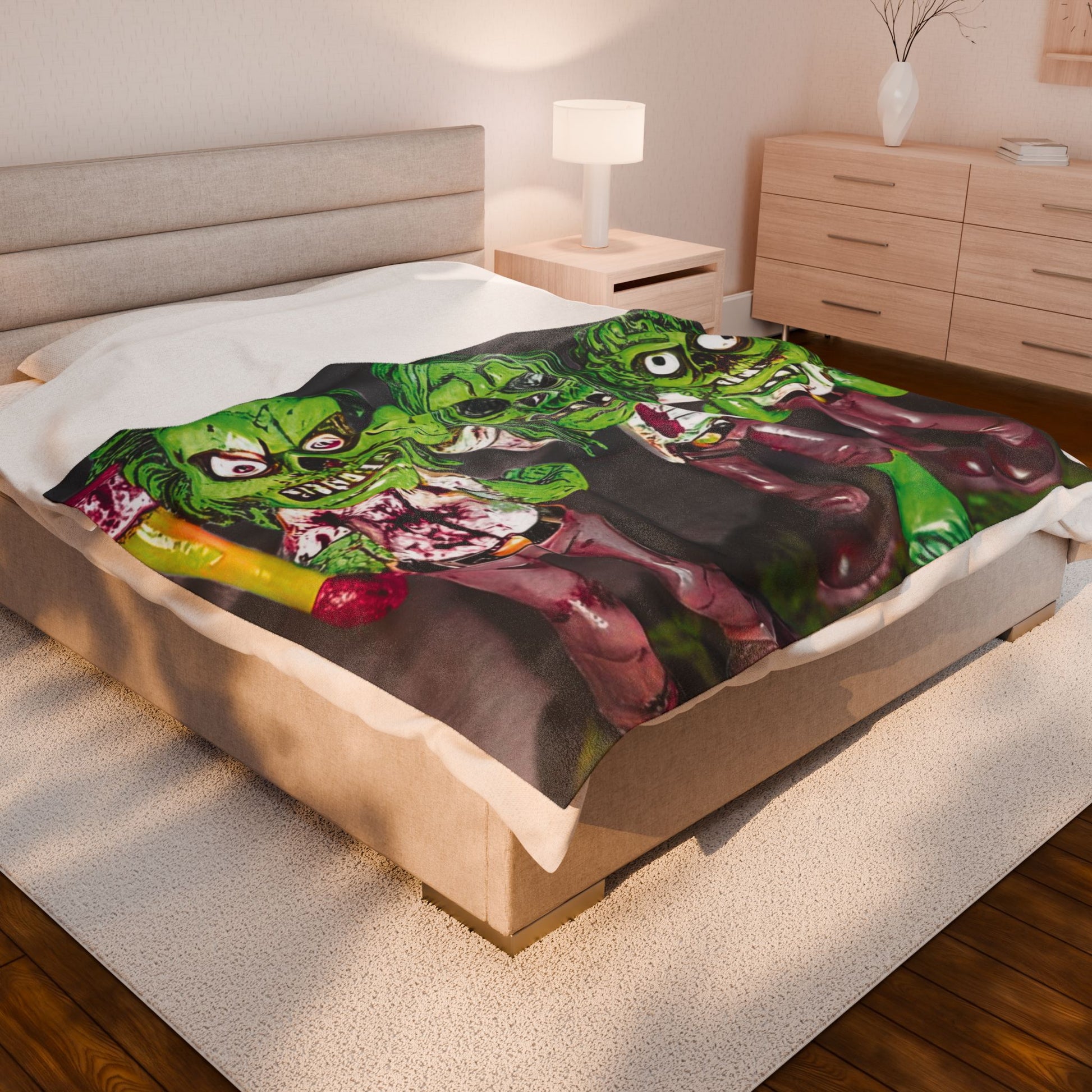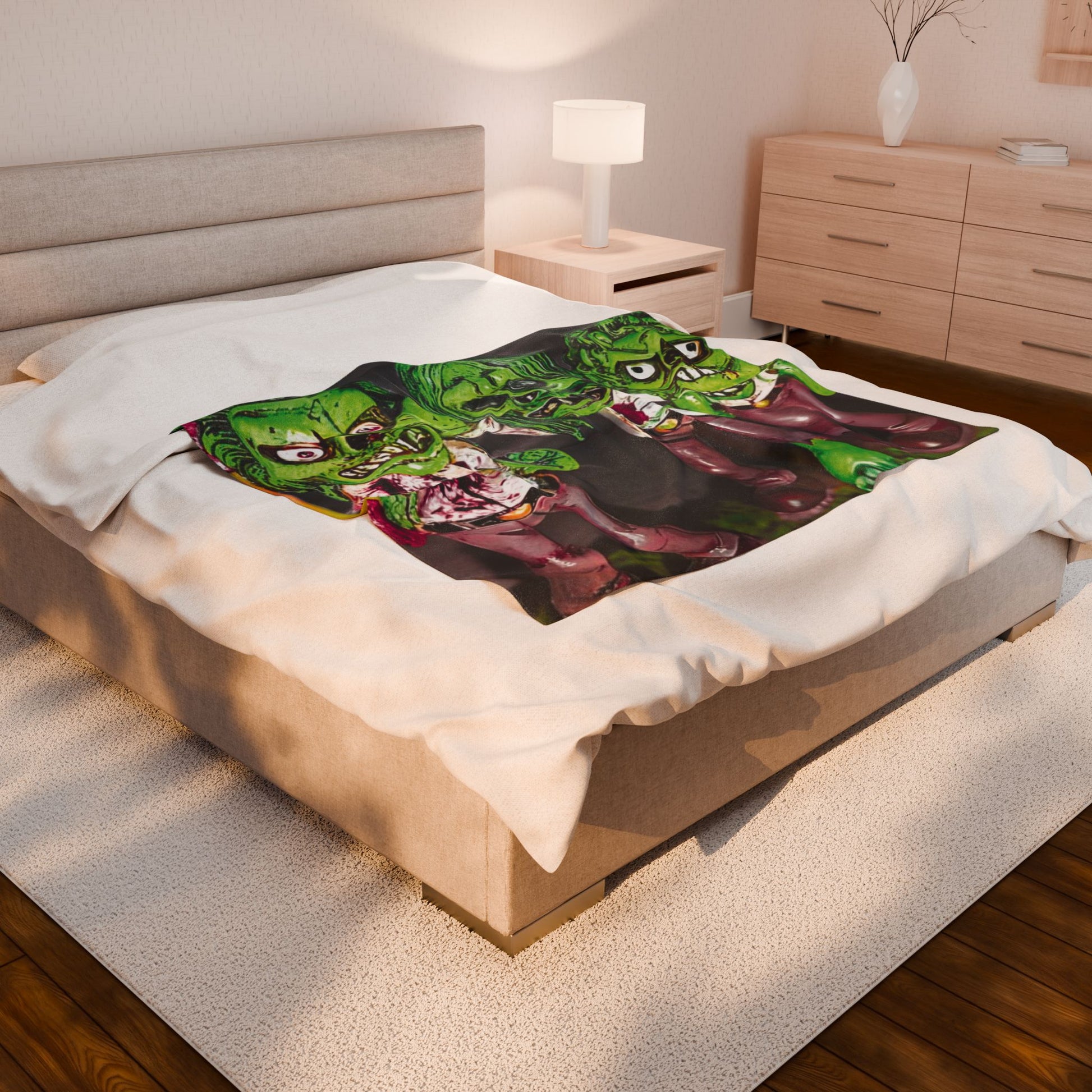 Wrap yourself in eerie charm and cozy comfort with this Velveteen Plush Blanket featuring adorable zombie toy dolls inspired by the timeless theme hear no evil, see no evil, speak no evil. With its cute-creepy green design, this blanket perfectly balances spooky and sweet, making it a standout piece for Halloween lovers and horror fans alike. Soft, plush, and irresistibly cozy, it’s perfect for movie nights, seasonal décor, or gifting to anyone who loves their comfort with a playful spooky twist.