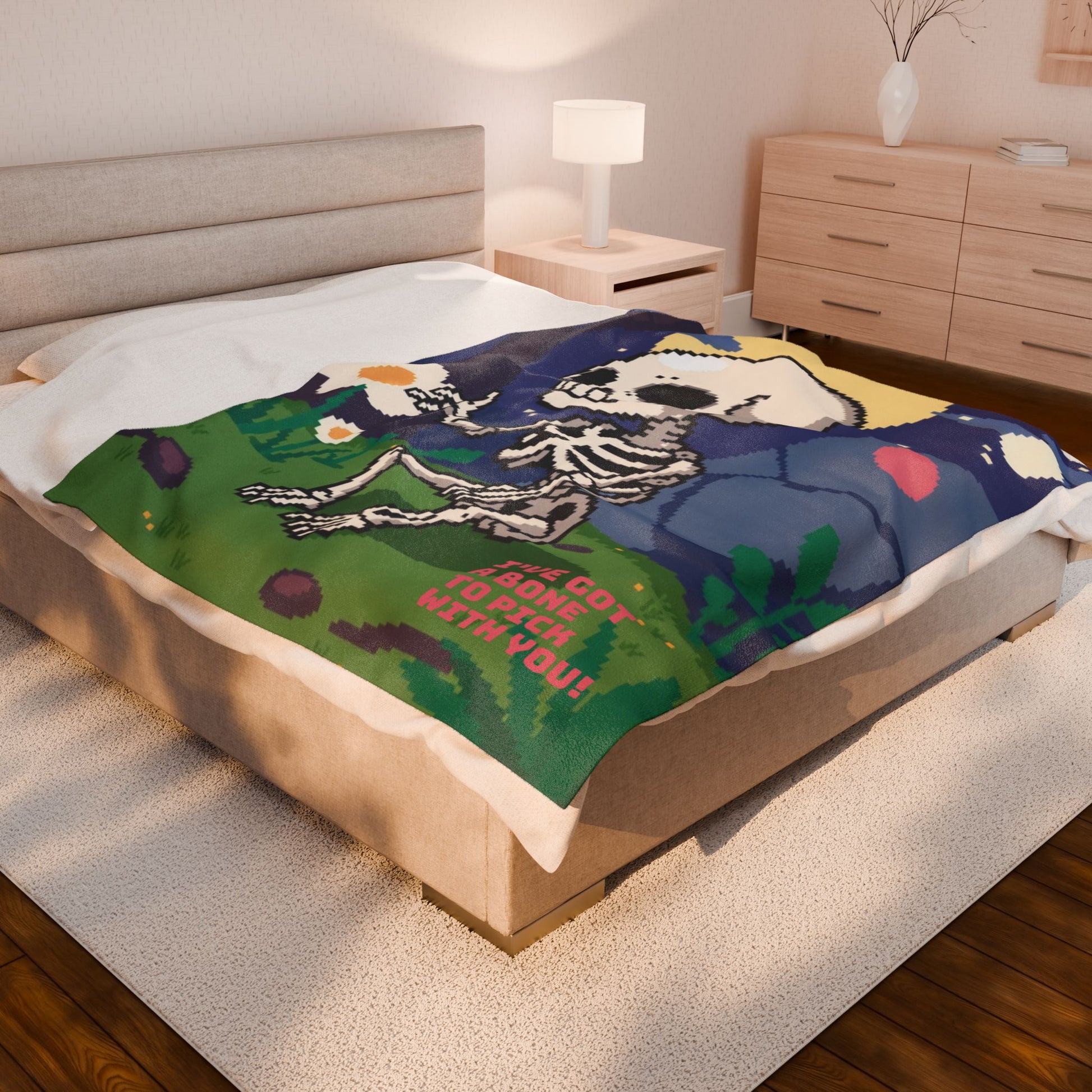 “I’ve Got a Bone to Pick With You” Skeleton Pixel Art Plush Blanket – Cute Cozy Throw for Halloween, Gamers & Fun Home Décor